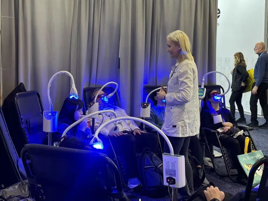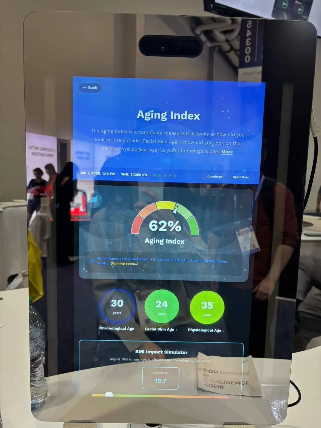 这个镜子因为据称能照一照(照30秒)就能测出你的疾病风险和老化速度而大排长队——大家都想让AI来看看面相。它通过一种叫“经皮光学成像(Transdermal Optical Imaging, TOI)”的技术读取面部血流模式,进而评估心率、血压、心血管风险、代谢状态、生理年龄,甚至心理健康,最后汇总成一个1到100分的长寿评分。它对我的焦虑水平和睡眠质量判断得还挺准,心率和血压数据也和我的智能手表已知数值差不多(血压功能还在等FDA审批),但BMI明显不准。售价899美元。