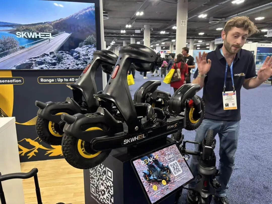 这就是我们来CES想看的东西!飞天汽车,家务机器人,还有越野滑板,就是那种你小时候会在作文里写的“2025年未来世界”会有的通勤产品。Skwheel主创说,他们太喜欢滑雪了,没有山没有雪也想滑,所以就做了这么个玩意儿,它能通过自然的旋转、渐进的倾斜和精准的操控,重现刻滑时的身体反馈。最高时速60公里,续航35–40公里,售价1490欧元。对了这个东西就来自鱼塘激战区的法国战队。