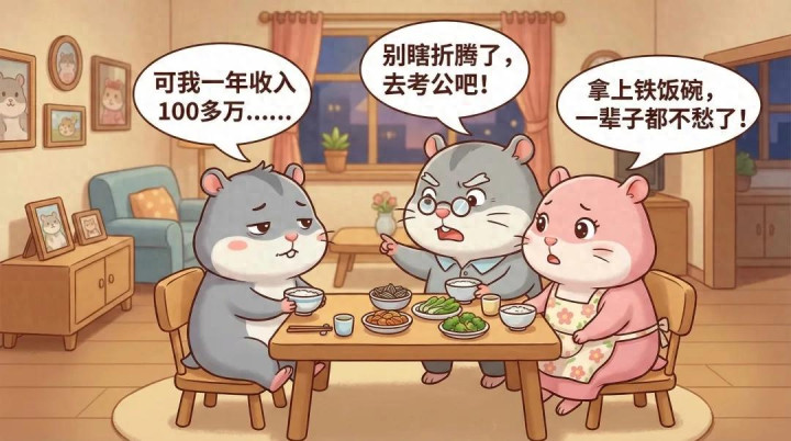 他在帖子里面自爆说,凭借多年的努力,到现在已经年薪100多万,可是每次回老家跟爸妈聊天的时候,爸妈还在劝自己:“别瞎折腾了,早点去考公,将来拿上铁饭碗,一辈子都不愁了!”
