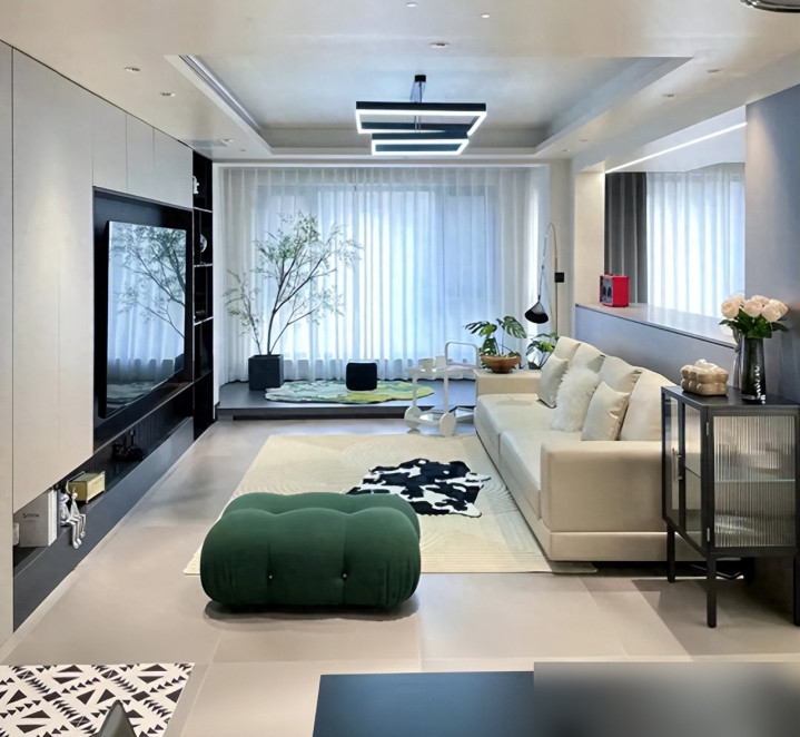 像他家把横厅布局提前规划好,阳台抬高地台当茶室,吊轨推拉门轨道藏顶上不留卫生死角——这些功夫下在前面,住进去十年都省心。