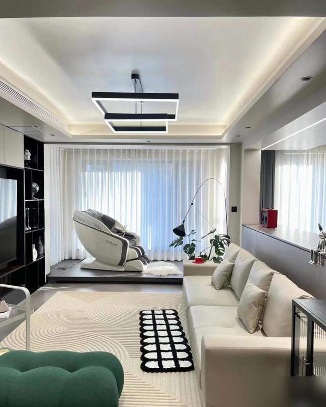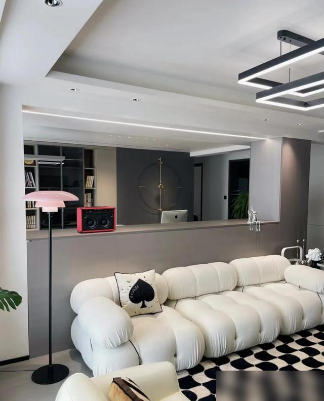 最想拍大腿叫好的是沙发后面那排半高柜,既填平了沙发不靠墙的空落感,又多出两排储物格,比砌堵死墙聪明太多。